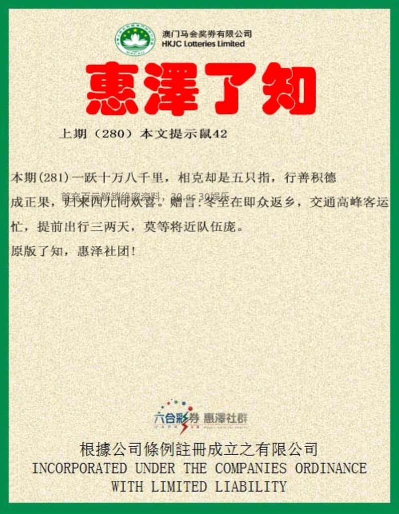 281期:一跃十万八千里,解18鼠。相克却是五只指,解05牛。行善积德成正果,归来四九同欢喜。解吉肖兔龙蛇马羊鸡。赠言:冬至在即众返乡,交通高峰客运忙,提前出行三两天,莫等将近队伍庞。