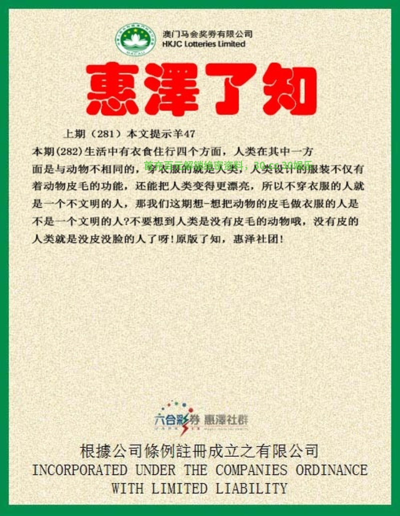 282期:生活中有衣食住行四个方面,人类在其中一方面是与动物不相同的,穿衣服的就是人类,人类设计的服装不仅有着动物皮毛的功能,还能把人类变得更漂亮,解美肖兔龙蛇马羊鸡。所以不穿衣服的人就是一个不文明的人,那我们这期想-想把动物的皮毛做衣服的人是不是一个文明的人?不要想到人类是没有皮毛的动物哦,没有皮的人类就是没皮没脸的人了呀!